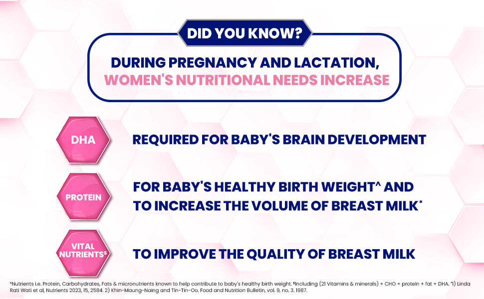 It contains 25 vital nutrients that are important to provide the nutrition for the mother’s health and baby’s growth. It contains 100% RDAs^ of Vitamin B2, Vitamin B12 and Vitamin C during pregnancy and 100% RDAs^ of Folic acid and Iron during lactation.