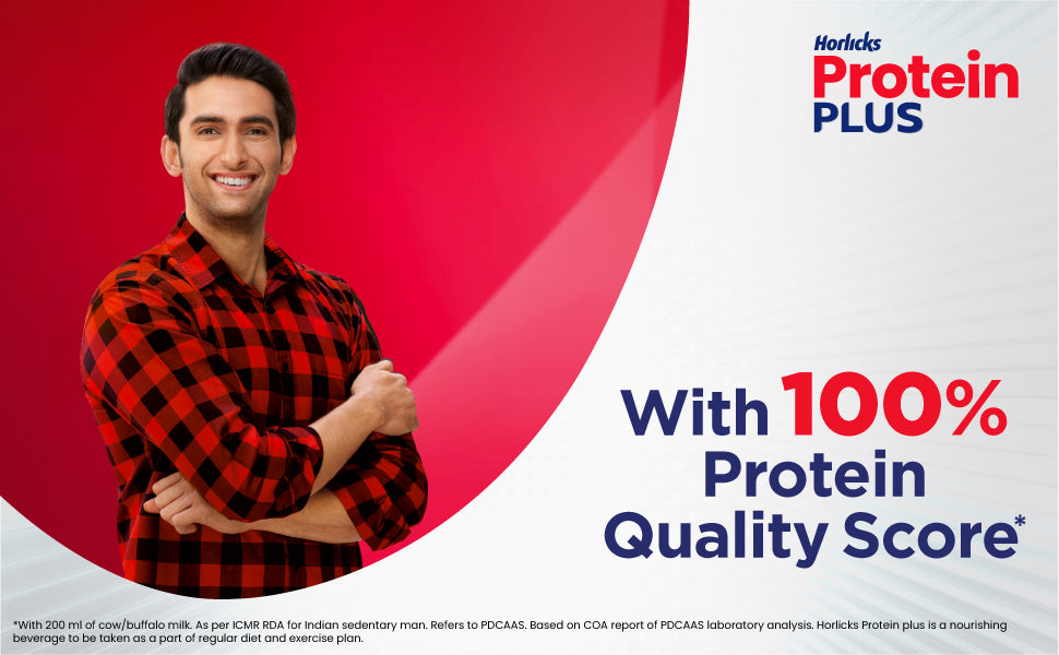 Did you know that “Adults need 1 gram of protein per kilogram of body weight." Add Horlicks Protein Plus to your daily diet to help meet your daily protein needs. It delivers 34 g protein in 100 g of the product.