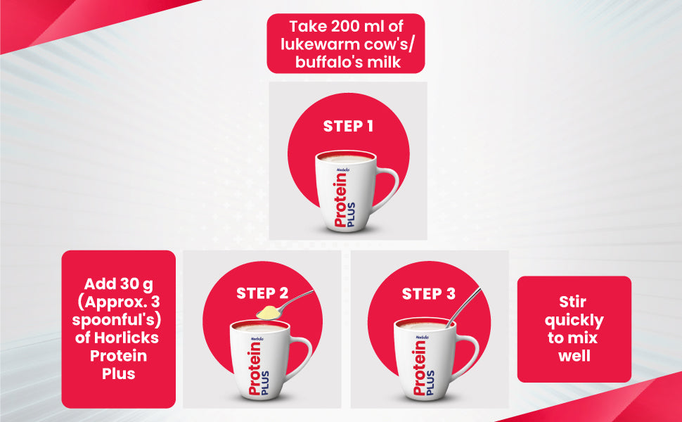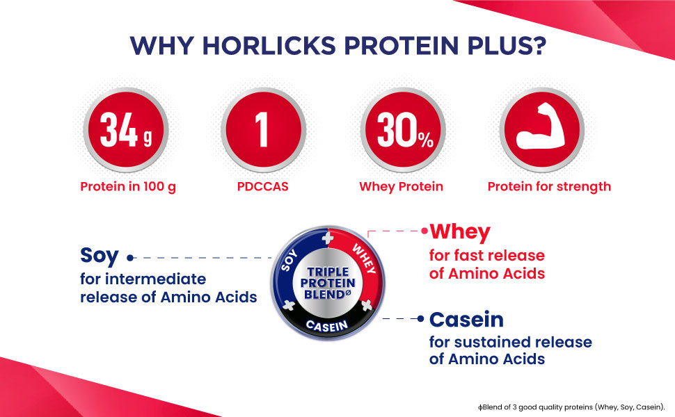 Horlicks Protein Plus contains 3 high quality proteins which include fast acting whey, intermediate acting soy protein and slow acting casein. The 3 Proteins in Horlicks Protein Plus contain all the essential Amino Acids needed to build and maintain muscle mass which is important for strength.