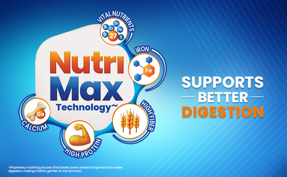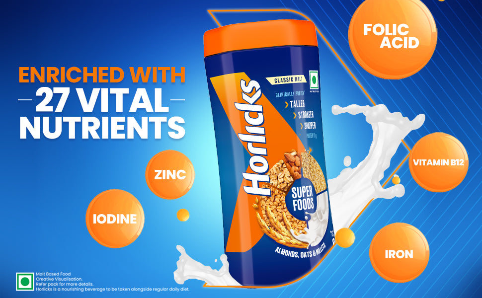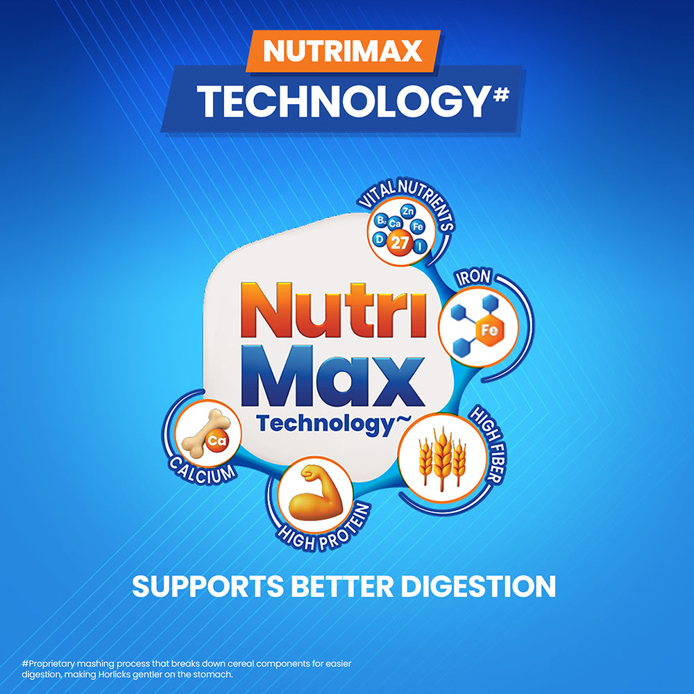 Horlicks is India’s #1 Family Nourisher, Trusted for Over 100 Years. The new Horlicks delivers wholesome nutrition with clinically proven benefits for Taller, Stronger, Sharper growth in children and enhanced immunity for the entire family. Now enriched with a Superfoods blend of malted barley, millets, oats, and almonds, Horlicks is a rich source of protein, fiber, and 27 essential vitamins and minerals, contributing to daily nutrition. It offers 6X more fiber (soluble + insoluble) to support digestion and promote gut comfort. Also Available in Zero Added Sugar variant
