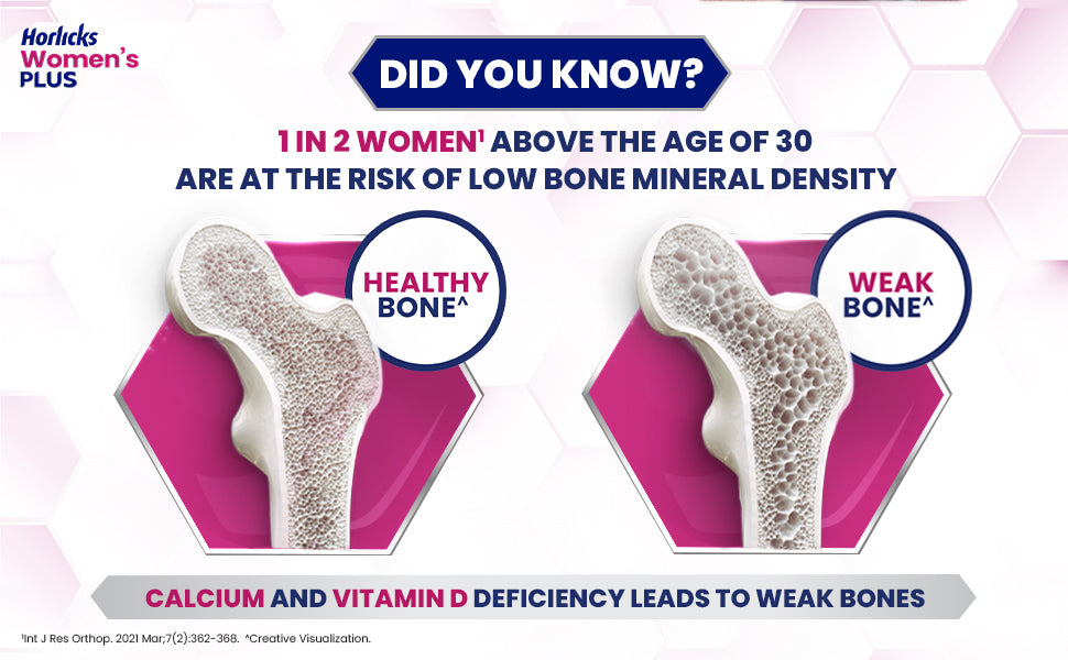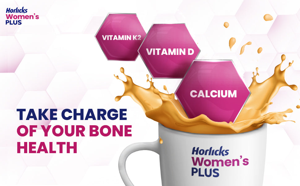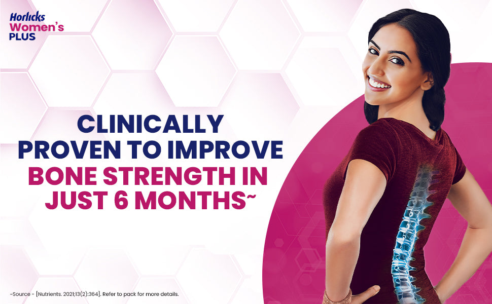 Horlicks Women's Plus, a specialised health drink for women is formulated with the unique combination of Calcium, Vitamin D and Vitamin K2. This blend in Horlicks Women's Plus is clinically proven to improve bone strength in 6 Months.